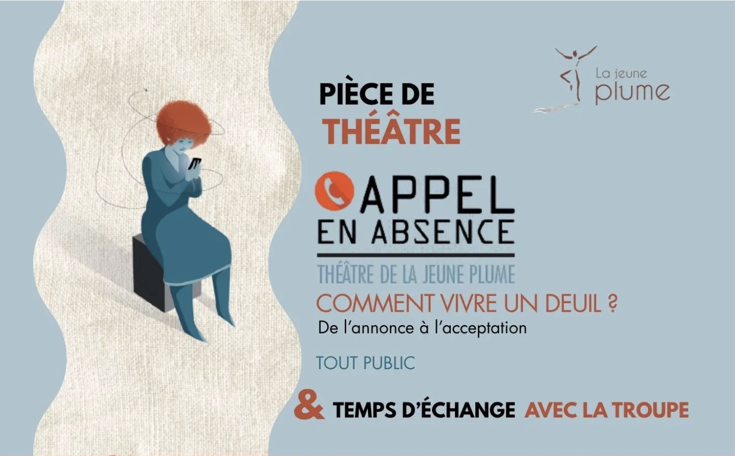 Vous êtes invités à assister à la pièce de théâtre « Appel en absence », présentée par la troupe La Jeune Plume. Ce spectacle chaleureux et délicat aborde le thème « Comment vivre un deuil ? De l’annonce à l’acceptation » et sera suivi d’un temps d’échange.